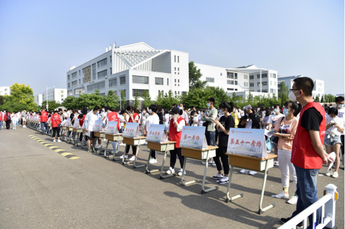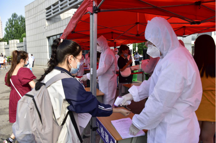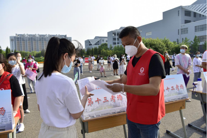 考试当天,为确保各位考生的身体健康安全,进校前,学校工作人员对考生逐一进行了体温检测、更换学校统一的一次性防护口罩等各个方面的防疫举措。